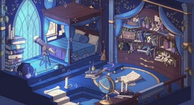 Астрологическая комната, если переиначить, тёмно-синих и коричневых тонов. Пол здесь ярусный, ступенчатый, но не слишком с большой разницей в высоте. Книжный шкаф огромный, пожалуй, самый большой на весь жилой этаж. Заставлен всякими разными книгами, посвящёнными учёбе и астрологии, разумеется, преимущественно. Шкаф дверей не имеет, внизу — два длиннющих выдвижных ящика для личных вещей проживающих. Вместо дверей — завешивающиеся шторы, которые чаще всего подцепляются к колоннам.