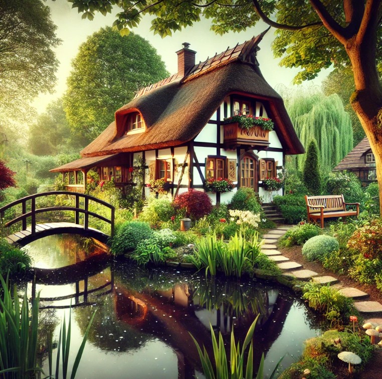 Этот уютный и живописный гостевой домик, состоящий из двух комнат, расположен на краю небольшого пруда, окружённого садом с яркими деревьями и цветущими кустарниками. Мостик ведет к крыльцу, а неподалёку находится скамья для отдыха среди природы. Интерьер оформлен в небесно-голубых тонах. Как и его собрат, находящийся рядом, не предназначен для любопытных учеников и студентов.