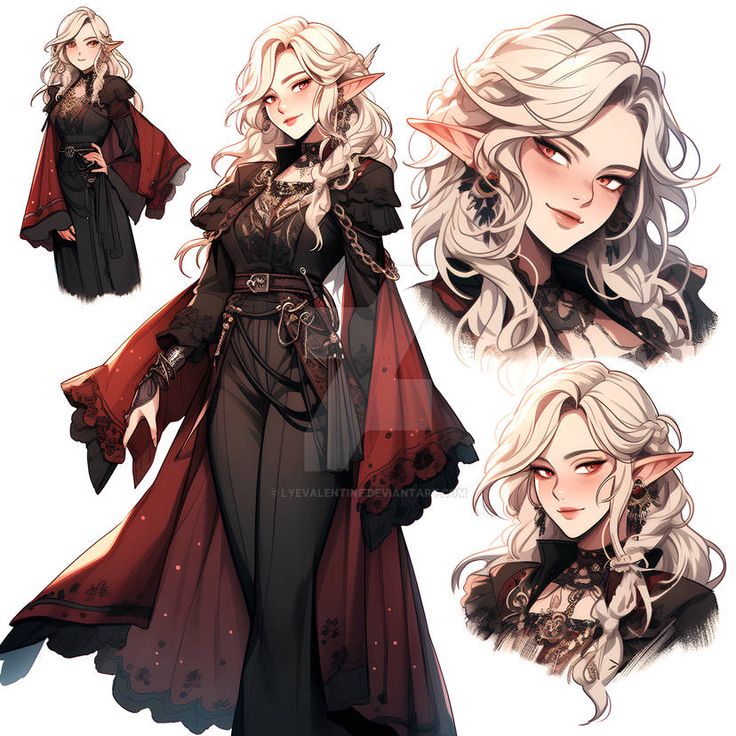 Одежда: черное платье с золотыми вставками, перчатки, сапоги.